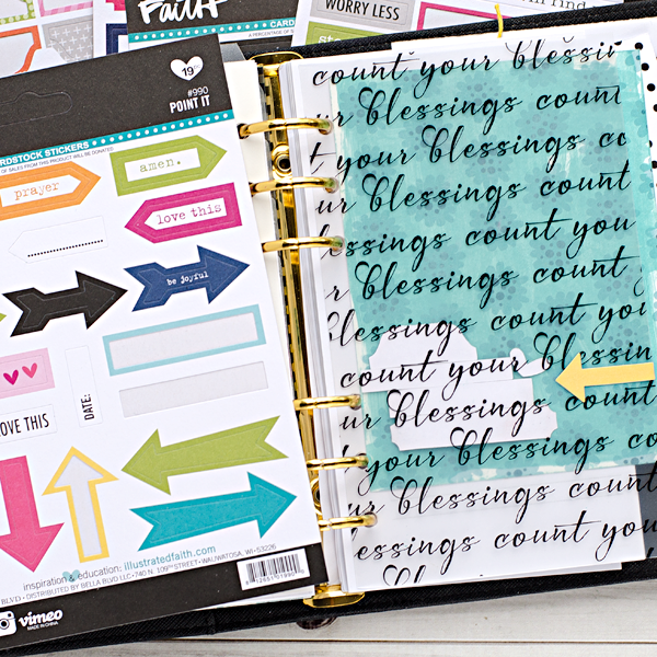 This last divider I really wanted to highlight “count your blessings” so I strategically placed the stickers on the back side to cover those words and added an arrow to the front side to really point it out.