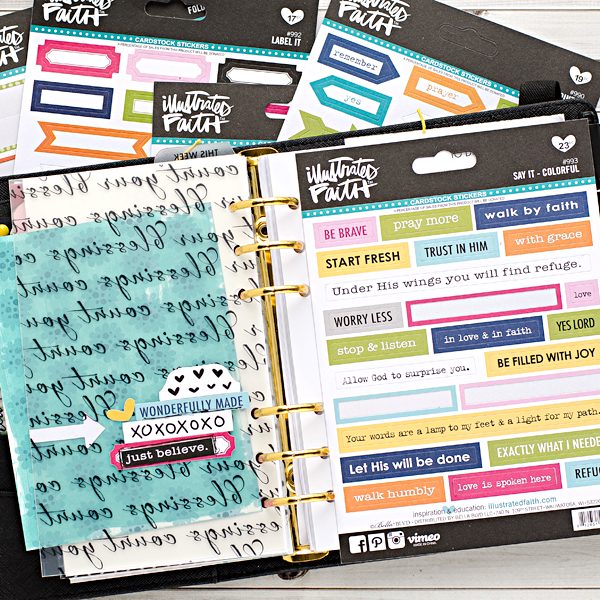 Hey there, Heather here again to share more of my planner with you. Yesterday I shared how I used the tab stickers to make the dividers in my planner and today I’m sharing how I’m decorating some of them using the rest of the 5″x7″ sticker sheets and also using the Illustrated Faith pen to doodle and outline. I love how it doesn’t clog when writing over dry paint. I love to outline stickers to make them really pop out too.