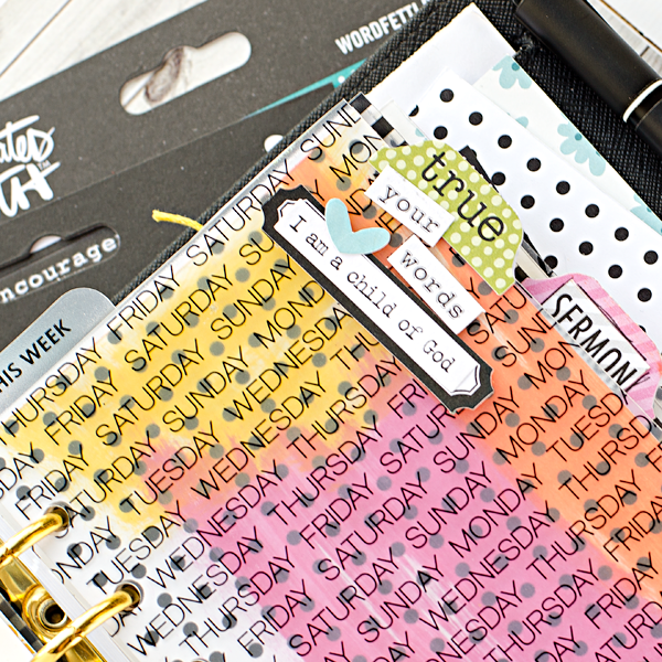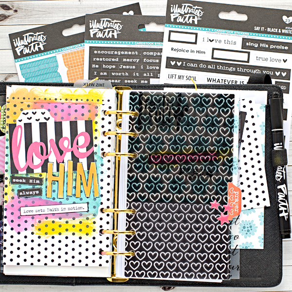 For my first divider which is for Bible study notes, I added in some of the fun “wordfetti white” stickers, a “label it” sticker, and a “Say It – Black & White” sentiment over the label. I also added a heart from the “Love It” stickers.