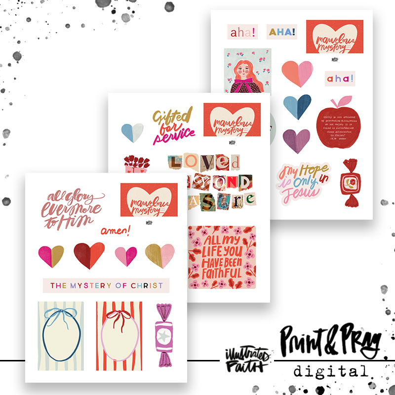 Enjoy these pieces of ephemera that coordinate with the “Marvelous Mystery” devotional kit! These are perfect for collaging, layering, & illustrating your faith!