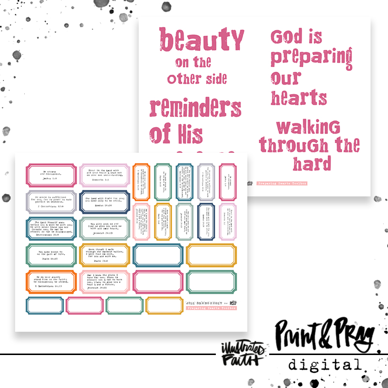 This toolbox was designed to use alongside the Preparing Hearts devotional kit. It includes scripture labels from the kit typed out for you on Jill’s vintage 1957 Royal typewriter, a few blank labels, bonus scripture labels in a mini size, and title starters directly from the devotional. If you’d like your typed scriptures on something other than a label, you can always print the labels on translucent paper (like clear sticker paper, acetate, or vellum) and then cut the scripture out of the center to adhere to anything you want to. Or cut them into strips for scripture wordfetti!