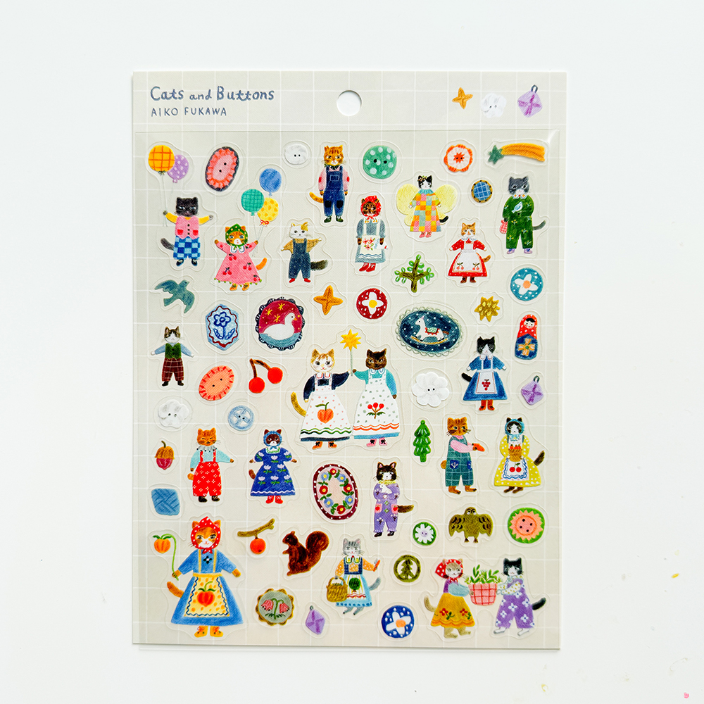 This sticker sheet depicts a theme of dressed-up cats and colorful buttons. The artist Aiko Fukawa’s style is vibrant, lively, and has a fairytale quality, bringing a joyful atmosphere to your creative projects.