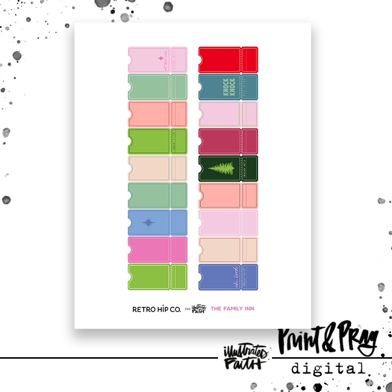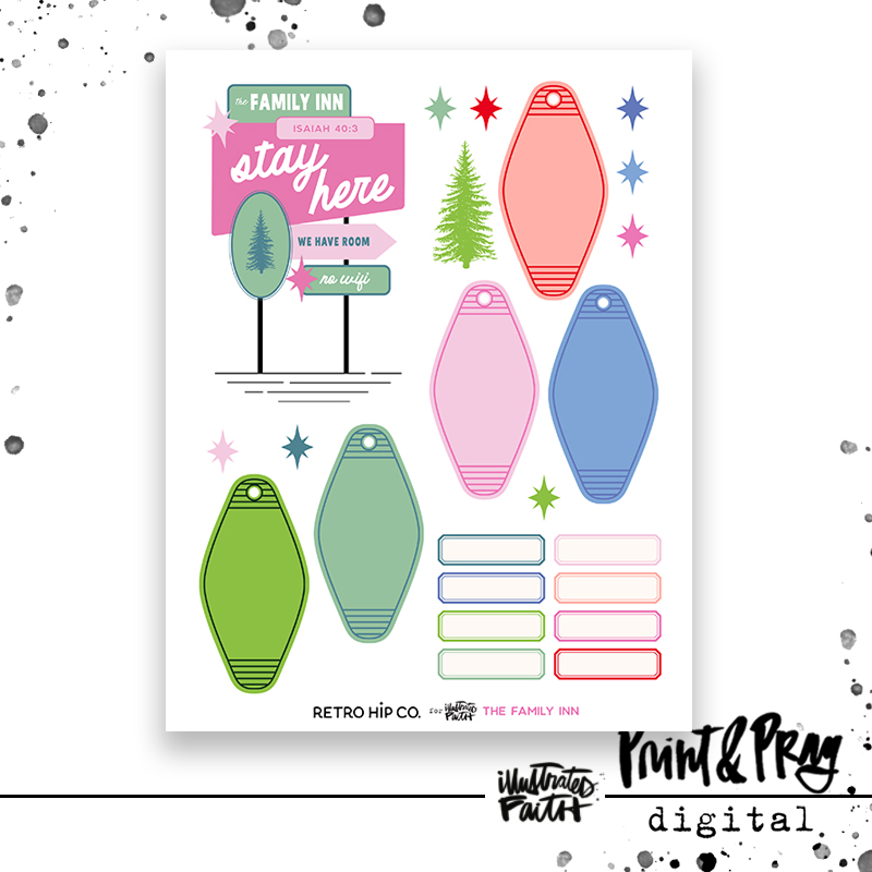 Inspired by the inn that had no vacancy, The Family Inn brings a cozy vintage motel vibe to your Advent pages. This two–page set includes a retro sign, motel keychains, and colorful ticket strips that coordinate beautifully with the Illustrated Faith kit.