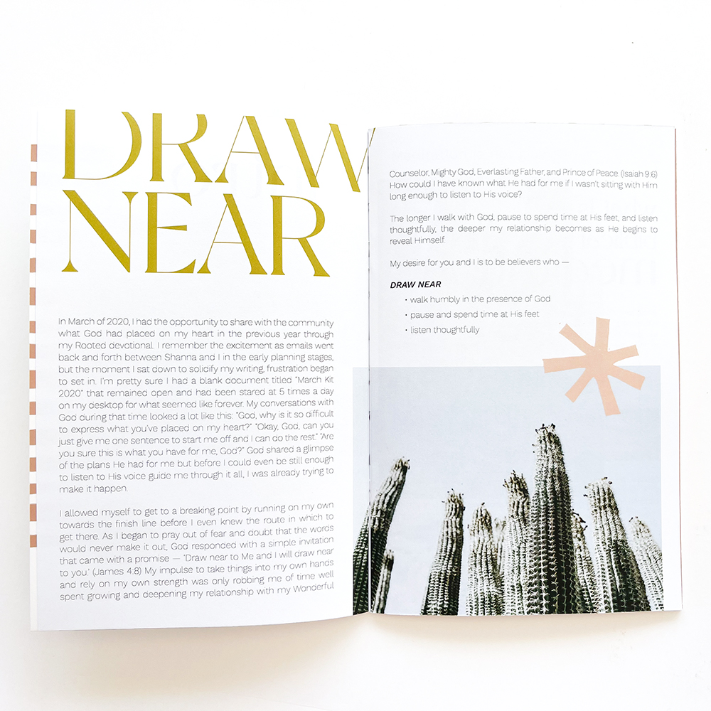 In March of 2020, I had the opportunity to share with the community what God had placed on my heart in the previous year through my Rooted devotional. I remember the excitement as emails went back and forth between Shanna and I in the early planning stages, but the moment I sat down to solidify my writing, frustration began to set in. I’m pretty sure I had a blank document titled “March Kit 2020” that remained open and had been stared at 5 times a day on my desktop for what seemed like forever. My conversations with God during that time looked a lot like this: “God, why is it so difficult to express what you’ve placed on my heart?” “Okay, God, can you just give me one sentence to start me off and I can do the rest.” “Are you sure this is what you have for me, God?” God shared a glimpse of the plans He had for me but before I could even be still enough to listen to His voice guide me through it all, I was already trying to make it happen.